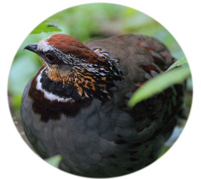 For much of the day, the collared-hill partridge remains well-camouflaged amongst leaves and grasses on the forest floor. Little has been documented about the species as it lives in a natural state, but is believed to be omnivorous similar to other species, feeding on seeds, insects, and fallen berries. At night-time, birds go to roost in a communal tree. If its social habits are similar to those of its closest relatives, then it travels in groups, referred to as ‘coveys’, which number from 5 to 10 in size. Details on predation have not been documented; but eggs are possibly eaten by wild boars and rats; and grown animals may be fed on by feral cats and foxes. The call, like that of other partridges, and especially the Necklaced hill-partridge, is somewhat plaintive; a rising ‘woop’ which is repeated consistently, or a ‘co-quee’ if the bird is singing in duet. In the wild the species breeds from April until May; though in captive individuals kept within China breeding has been observed from February until August.