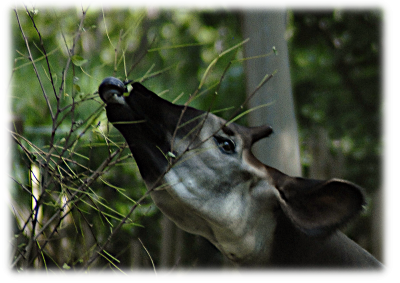 The most scientifically important area of okapi habitat might be that of the Ituri Forest in Congo. It lies on the north-east of the Congo River basin, with acidic soils and hilly terrain – up to 1000 metres above sea level. It is also rather humid – humidity staying around 75%, with a temperature of 31 degrees. Rain falls at a tally of 75 inches a year – most in October and November – when flooding is common – and least immediately afterwards. The forest floor is covered with roots – the byproduct of a thick canopy; so that little sunlight reaches the forest floor. It is in this darkness that the okapi thrives – with the streaks of sunlight that reach the floor being not unlike the white stripes of the okapi. Okapis typically find refuge in dark, thick foliage making them hard to observe; but observation is easiest when they come to the exposed river to drink. They restrict themselves to these canopy forests, avoiding human settlements and savannah. They also avoid swamp – though they remain in areas of forest during seasonal flooding. Okapis seem to prefer feeding at areas of forest exposed by fallen trees, where light breaks through to allow small plants to grow. Fast-growing, lower-level plants such as these seem to be some of the okapi’s preferred foodstuff. The plants of the Congo also contain specific, individual toxins – so okapis cannot settle for monotony in diet; so foraging involves the collective browsing of various species – about one hundred of which have been observed. This is much of the reason that okapis move up to 2.5 kilometres in a day. It might also, not unlike animals like tapirs, consume clay. It eats about 5 kilogrammes of such leaves a day. It uses its long tongue to strip leaves off trees to avoid eating branches – as it also refuses to eat wood. It also seems to refuse to consume moss, as well as immature and dying leaves. The digestive system of the okapi breaks down cellulose very well – but is inefficient at breaking down starch and other sugars. Sometimes it also consumes fruit.