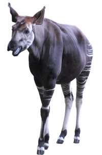 with a long neck. The hide is slightly oily, making it appear reflective. The pygmy hippopotamus also has an oily covering – which it uses to reflect heat – so it might be that the okapi does the same. The oil the okapi secretes also makes it waterproof, which is useful during the wet season. The hide is mostly dark brown or black. The okapi is about 2.5 metres in length, 1.5 metres at shoulder, with males weighing 220 kilogrammes at median, and females 310 kilogrames. Females, unusually, are larger than males. The neck has a few wrinkles, though the animal is not entirely wrinkly. Much of the head is white in colouration with dark eyes and dark surrounding areas, as well as dark areas around the snout and mouth. The area where the skull is distinguished from the neck is particularly visible, as are various veins on the animal’s head, and there is a slight lighter area between the back legs and torso. The front legs have a few thick, white stripes – about 6, but sometimes above or below that number. There are also two large white areas – one above the knee and another larger below – as well as one more above the hoof. The back legs also have a larger number of moderately thin, markedly zebra-like stripes – with a very large white area covering the area from below the ankle to close to the bottom of the thigh, with one more stripe again surrounding the hoof. The tail, about 35 cm long, has a few slight stripes as well, though in some animals they are notable. It has a light-blue tongue, about 30 centimetres long, which can be used to strip away leaves – and lick various areas of its face. Like the giraffe, the male okapi has a pair of ossicones above the eyes. The ears are large, and have a slight covering of tufted hair. Okapis have scent glands on their feet – leaving behind a tar-esque substance with a distinct smell. Unlike most quadruped mammals, but like giraffes, the left legs on either side move in conjunction before the right legs do so, doing so with its head facing the ground.