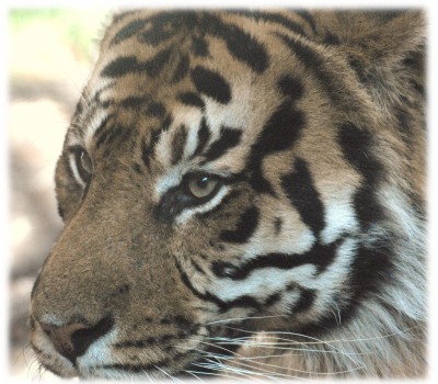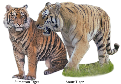 The texture of tiger’s fur is variable based on where the tiger is found – Sumatran tigers of the jungle which has a constant of 25 degrees Celsius have relatively thin fur, and have a more muscular consistency. They also have the most prominent facial ‘ruff’. They are also the smallest race of tiger – males about 120 kilogrammes and 2 metres in length, and females about 90 kilogrammes, and a slightly shorter length. The Amur, or Siberian tigers, found in areas of north-eastern China and small areas of far-eastern Russia, are the largest race of tiger – up to almost 3.7 metres [though most are closer to 3 metres], with males weighing in the region of 175 kg [up to 190 kg], and females in the region of 120 kg [up to 130 kg]. They have the thickest fur, which is also the most pale in colouration. The Bengal Tiger, found in India, can be considered as ‘intermediate’ – males are up to 3 metres in length and up to 225 kg in weight, with females slightly shorter and weighing up to 135 kg. The fur consistency is also ‘intermediate’.