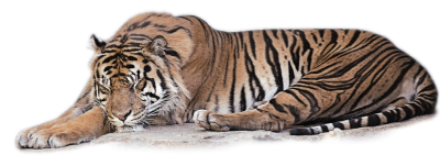The largest of any cat at up to 300 kilogrammes and up to 110 cm at shoulder, the skeletons of tigers and lions are so similar that even scientists have trouble telling the two apart without advanced investigation. It is only in living animals that many differences are clearly visible, but skeletons do show a few subtle differences as well. The skull of the tiger is slightly shorter than that of the lion – and tigers also have a slightly more narrow snout. The tail of the tiger is also slightly shorter than that of the lion. But it is pelage where differences are most obvious – tigers are orange or yellowish in colour, covered with numerous thick, vertical, black stripes. On the face the stripes circle around the shape of the face, and on the body they can circle almost the entire body, or end abruptly. Tiger stripes occur both from the bottom of the tiger as well as from the dorsal. The stripes also encircle the tail, until the very tip where the black markings form a veritable ‘territory’. The underside of the tiger, disregarding the black stripes, is coloured white. Stripes are less prominent on the legs when viewed face on, and side-on closer to the paw. Stripes are individual amongst tigers, and scientists who work with wild tigers in the field, typically done through camera-trapping, use the striped patterns of various tigers as identifying features. Unlike the patterns of leopards and jaguars, the striped pattern of tigers in embedded into the animal’s skin.
